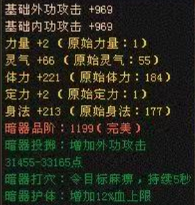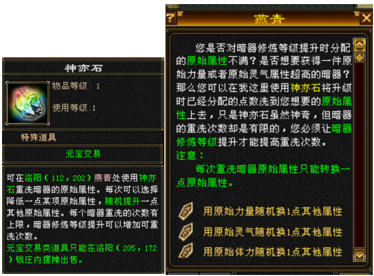 在最终确定暗器品质和修炼等级之后,可以通过神亦石,来对暗器的原始点数进行洗练,重新分配原始属性。比如将力量洗练随机重新分配为身法或者体力。