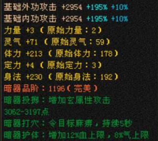 暗器护体是自身buff类强化效果,最佳效果是:血上限百分比+气上限百分比,次一级的有单血上限百分比加成、内外功百分比加成。