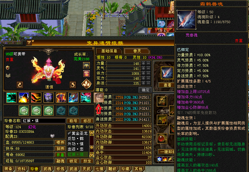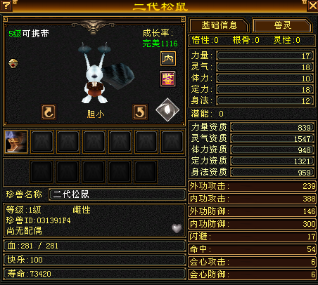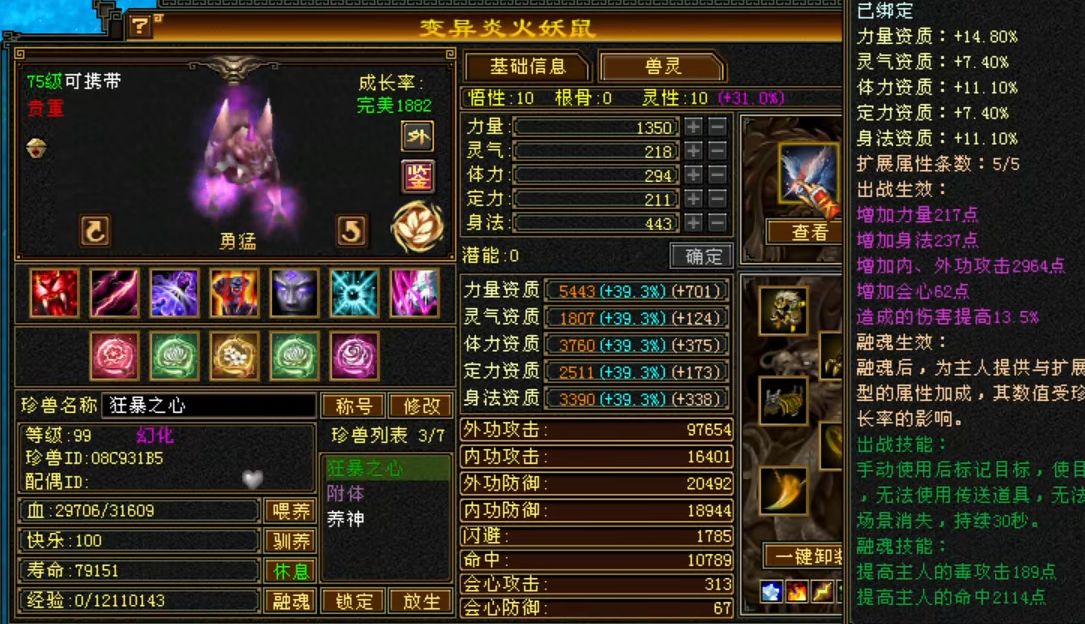 除了出战宝宝以外,还有兽魂融魂使用的“附体”宝宝,兽魂融魂使用的宝宝只需要打造成长率和资质即可,不需要额外的技能和等级,值得一提的是,融魂宝宝的成长率非常重要,尽可能选择自身可携带等级的大完美宝宝来进行融魂操作。
