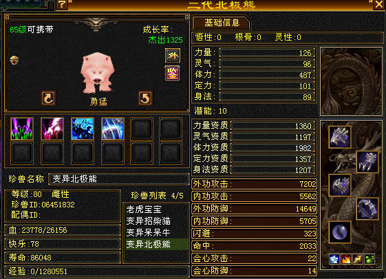 作为第二阶段的体力珍兽,北极熊可爱的外表下更是有着强健的体魄,很多玩家会选择北极熊打上高级血祭来作为第二过渡宝宝,可以一直使用到85级甚至更高的等级。